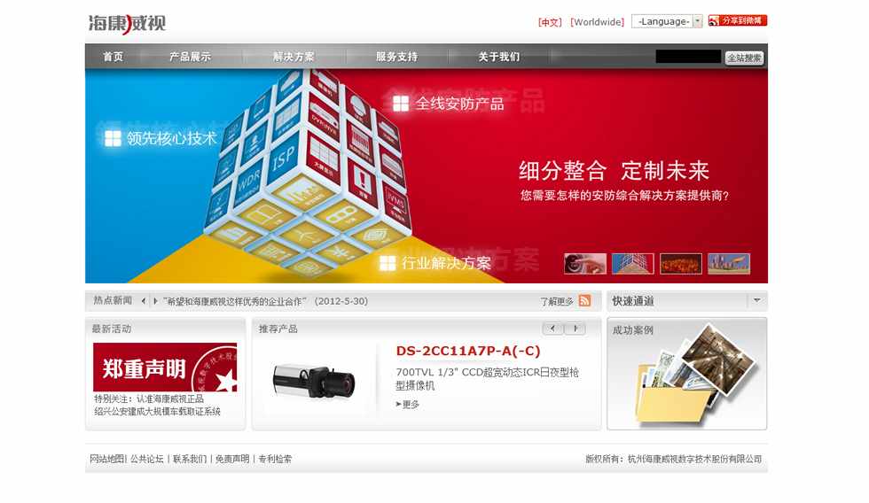 海康威视是领先的安防产品及行业解决方案提供商,致力于不断提升视频处理技术和视频分析技术,面向全球提供领先的安防产品、专业的行业解决方案与优质的服务,为客户持续创造更大价值。 海康威视拥有业内领先的自主核心技术和可持续研发能力,提供摄像机/智能球机、光端机、DVR/DVS/板卡、网络存储、视频综合平台、中心管理软件等安防产品,并针对金融、公安、电讯、交通、司法、教育、电力、水利、军队等众多行业提供合适的细分产品与专业的行业解决方案。这些产品和方案面向全球100多个国家和地区,在北京奥运会、大运会、亚运会、上海世博会、60年国庆大阅兵、青藏铁路等重大安保项目中得到广泛应用。 公司的营销及服务网络覆盖全球,目前在中国大陆32个城市已设立分公司,在洛杉矶、香港、阿姆斯特丹、孟买、圣彼得堡和迪拜也已设立了全资或控股子公司,并将在南非、巴西等地设立分支机构。 持续快速发展的海康威视,已获得了行业内外的普遍认可。公司连年入选“中国安防十大品牌”、中国安防百强(位列榜首);连续三年(2005-2007)入选德勤“中国高科技、高成长50强”、连续三年(2006-2008)入选福布斯“中国潜力企业”;连续五年(2007-2011)以中国安防第一位的身份入选《A&S》“全球安防50强” ;2011年名列IMS全球视频监控企业第1位,DVR企业第1位;连年入选“国家重点软件企业”、“中国软件收入前百家企业”等。